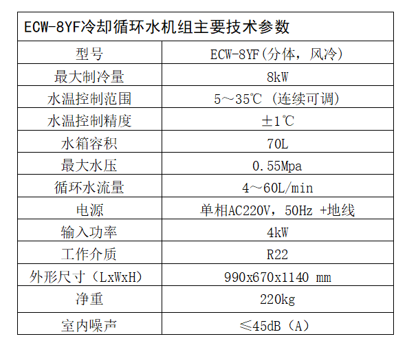 ECW-8YF系列一體水冷機(jī)是洛陽(yáng)森譜特電氣設(shè)備有限公司研制的專為X射線熒光光譜儀等儀器配套的設(shè)備。一體式冷卻循環(huán)水機(jī)組室內(nèi)機(jī)和室外機(jī)為一個(gè)整體,適用于沒有室外機(jī)安裝條件的場(chǎng)合,不需要制冷專業(yè)技術(shù)人員安裝,維護(hù)方便。控制部分采用西門子智能邏輯控制器+觸摸屏,控溫穩(wěn)定,有多重保護(hù)和報(bào)警功能,性能穩(wěn)定可靠。